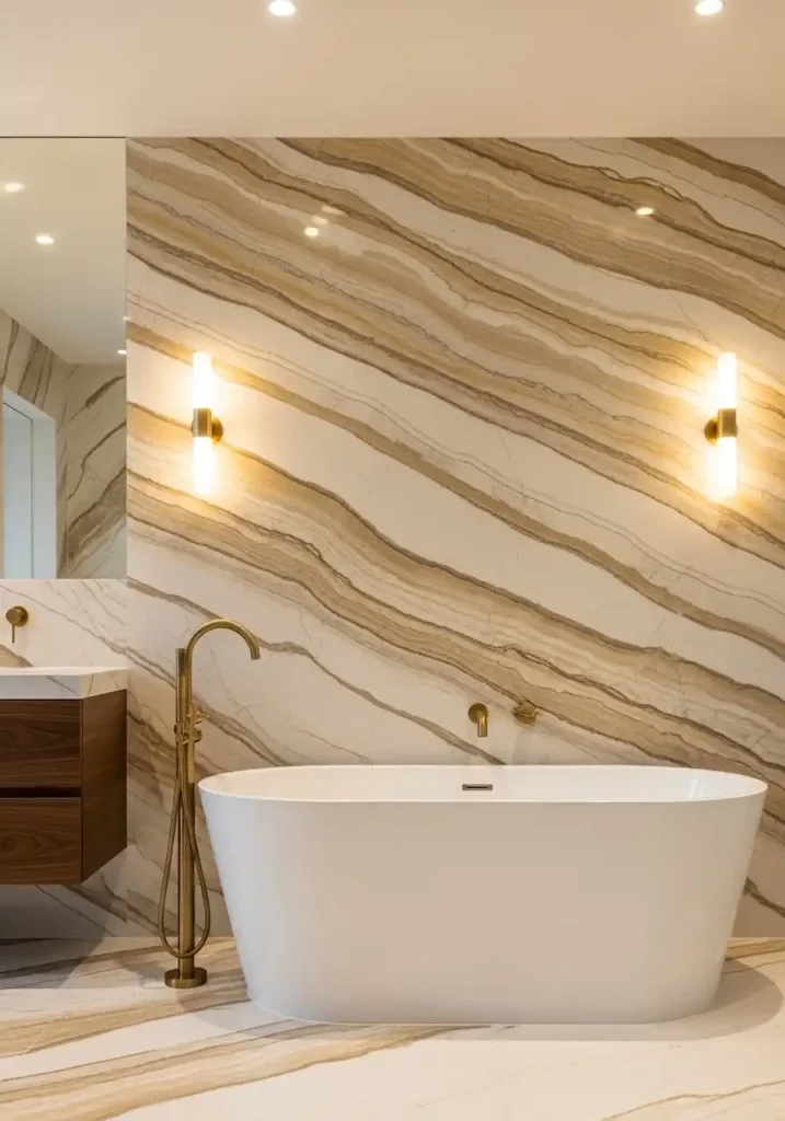 The most spectacular version of this design uses book-matched stone slabs — consecutive cuts from the same block of stone opened like a book to create perfectly mirrored veining patterns — which transforms the feature wall into something with an almost symmetrical, mandala-like quality that is genuinely mesmerizing to contemplate from a soaking tub. Warm ambient lighting on either side of the wall — either recessed into the ceiling to wash light down the stone’s surface or placed behind the tub to create a halo effect — reveals the stone’s depth of color and movement at their most beautiful and dramatic.