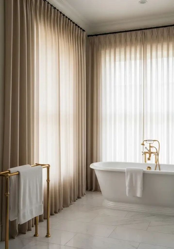 Linen is the most beautiful and most practically appropriate fabric for bathroom drapery — it is naturally moisture-resistant, it launders easily, and it has a textural quality and a particular way of draping that combines effortless elegance with an organic, lived-in warmth. Floor-to-ceiling panels in warm ivory, soft white, or barely-there gray create a visual softness in the bathroom that makes the room feel genuinely hotel-like — wrapped, considered, and designed to feel as good as it looks. The acoustic dampening quality of generous fabric in a hard-surfaced room is something you feel immediately and instinctively, and it contributes enormously to the spa-like quality of the space.