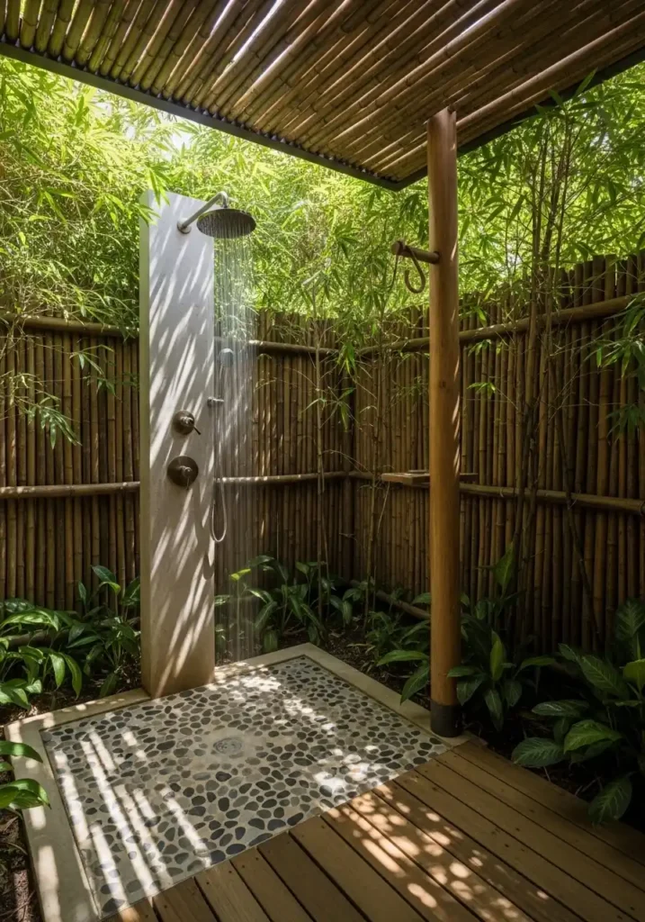 Creating a successful private outdoor shower requires generous, lush planting for complete privacy — bamboo, tall ornamental grasses, dense tropical foliage, or a combination of all three — combined with beautiful natural materials that age gracefully in outdoor conditions: teak decking, natural stone or river rock floors, stainless or brass fixtures that develop beautiful patinas over time. A connection between the interior bathroom and the outdoor shower through a glass door or large sliding panel allows you to move between the two environments seamlessly, creating a bathing suite that encompasses both the designed interior and the living natural world beyond it.