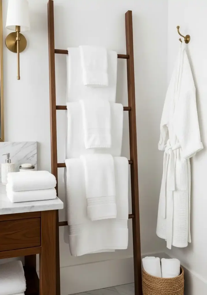 Achieving this hotel quality at home requires two things: investing in genuinely good quality towels — thick, heavy, and in a consistent white or neutral palette that creates visual cohesion — and developing a consistent approach to their display that treats presentation as a daily practice rather than an occasional staging effort. A dark walnut or bamboo towel ladder, brass towel rings, and a few generous hooks for robes and wraps provide the framework for this display. This is the kind of bathroom detail that is endlessly repinned on Pinterest because it is simultaneously aspirational and achievable — a genuine luxury that requires discipline and a good towel budget rather than an architectural renovation.