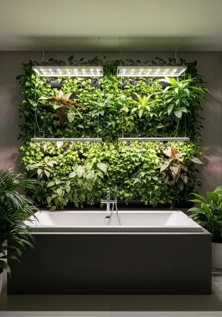 A fully integrated hydroponic living wall system — with its own water circulation, grow-light supplementation, and nutrient delivery — transforms the bathroom into a genuinely living environment of extraordinary beauty and biological richness. Lush tropical ferns, trailing philodendrons, peace lilies, and mosses thrive in bathroom conditions, creating a wall of living green that changes subtly every day as plants grow and shift. The oxygen they produce, the air they purify, and the simple visual pleasure of living greenery surrounding your morning shower or evening soak creates a spa-like quality that no purchased product or designed surface can fully replicate.