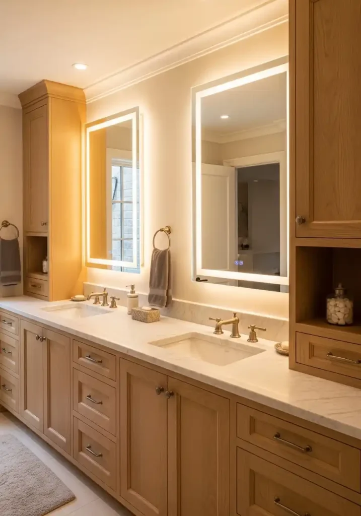 A double vanity is the design decision that most reliably transforms a shared bathroom from a source of morning conflict into a genuinely pleasurable shared experience — but in a luxury bathroom, the double vanity is so much more than just two sinks side by side. It’s an opportunity to create a beautifully symmetrical composition of warm wood, stone countertop, bespoke mirrors, and considered lighting that becomes the most used and most appreciated design feature in the entire home, touched and seen multiple times every single day by every person who lives there.