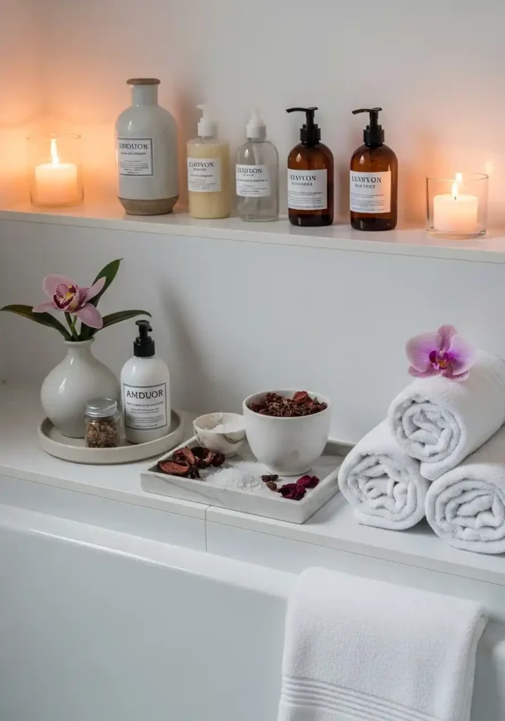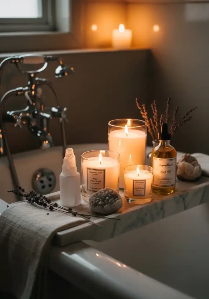 The ritual of lighting a candle before a bath is one of the oldest and most universally practiced acts of domestic self-care — and in a luxury bathroom designed for spa-like living, this ritual deserves a properly composed, beautifully styled space that honors and amplifies its intention. A marble tray beside the bathtub, arranged with two or three quality scented candles at varying heights, a small crystal or natural object of personal meaning, a sprig of dried botanical, and a beautiful bath oil bottle creates a composed vignette that functions simultaneously as decoration and as an invitation to slow down and be fully present.