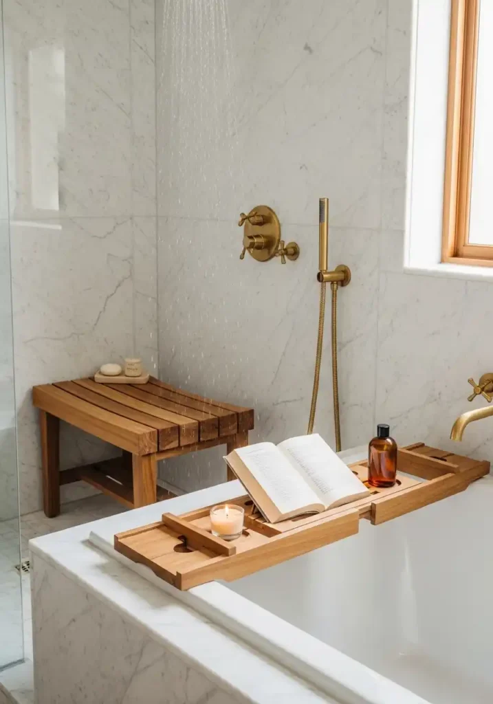 The shower bench serves both practical and aesthetic purposes — providing a surface for seated steam sessions, a place to rest a foot while shaving, or simply a beautiful horizontal element that breaks the verticality of the shower walls and adds a layer of material warmth to what might otherwise be an entirely hard and cold enclosure. The bath caddy, extending across the width of the soaking tub to hold a book, a candle, a glass of wine, and a small vessel of bath oil, transforms a simple soak into a composed, intentional experience of genuine domestic pleasure that is one of the most universally aspirational images on all of Pinterest’s self-care content.