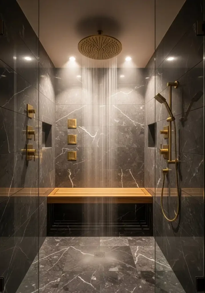 An oversized shower enclosure — large enough to move freely without touching the glass walls, with a built-in teak or stone bench for seated steam sessions — is the architectural prerequisite for this kind of spa shower experience. The bench transforms the shower from a standing activity into something more meditative and restful. Steam generators can be integrated invisibly into the shower’s mechanical systems, with simple controls mounted on the wall. When every element works together — rainfall head, body jets, steam, bench, beautiful tile, and warm lighting — the result is a daily experience that justifies every penny of its investment.