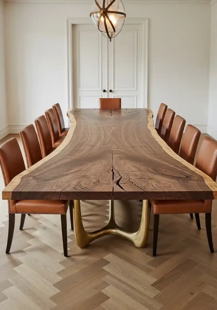 The most magnificent bespoke luxury dining tables are those where the choice of wood species and specific slab selection is made with the most personal and most enthusiastic involvement — visiting specialist sawyers and timber merchants to select the specific figured walnut, spalted maple, or ancient bog oak slab whose grain and figure most magnificently expresses the beautiful natural character of the specific tree it came from! Extraordinary flame figuring, quilted figure, or bird’s-eye patterns in the wood create table surfaces of genuinely unrepeatable natural artistry. A hand-forged bronze, brass, or iron base of sculptural design provides the most beautifully resolved structural support for the extraordinary timber above.