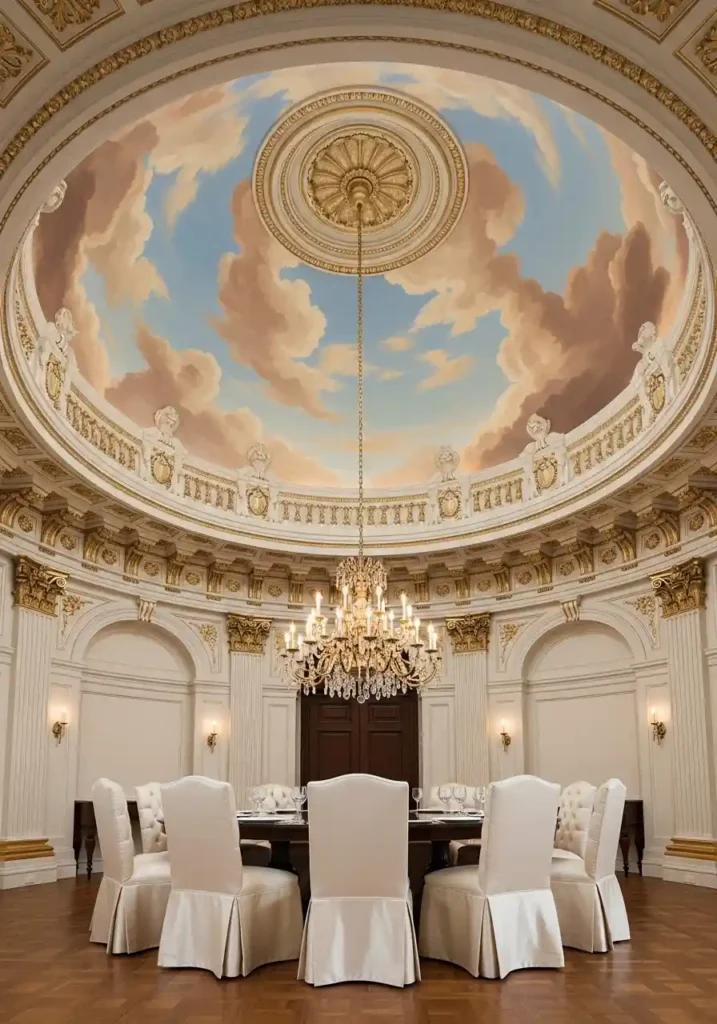 A domed ceiling in a luxury dining room is the most architecturally extraordinary and most genuinely magnificent structural feature available — the sweeping geometric purity of the dome creating a quality of overhead spatial drama and genuine architectural grandeur that flat ceilings of any decorative complexity cannot approach for sheer structural magnificence and spatial impact! A hand-painted sky fresco within the dome’s interior creates the most completely extraordinary and most genuinely magnificent painted ceiling available in any domestic context — the painted sky creating the breathtaking impression of dining beneath an open, luminous heaven of genuine painterly beauty.