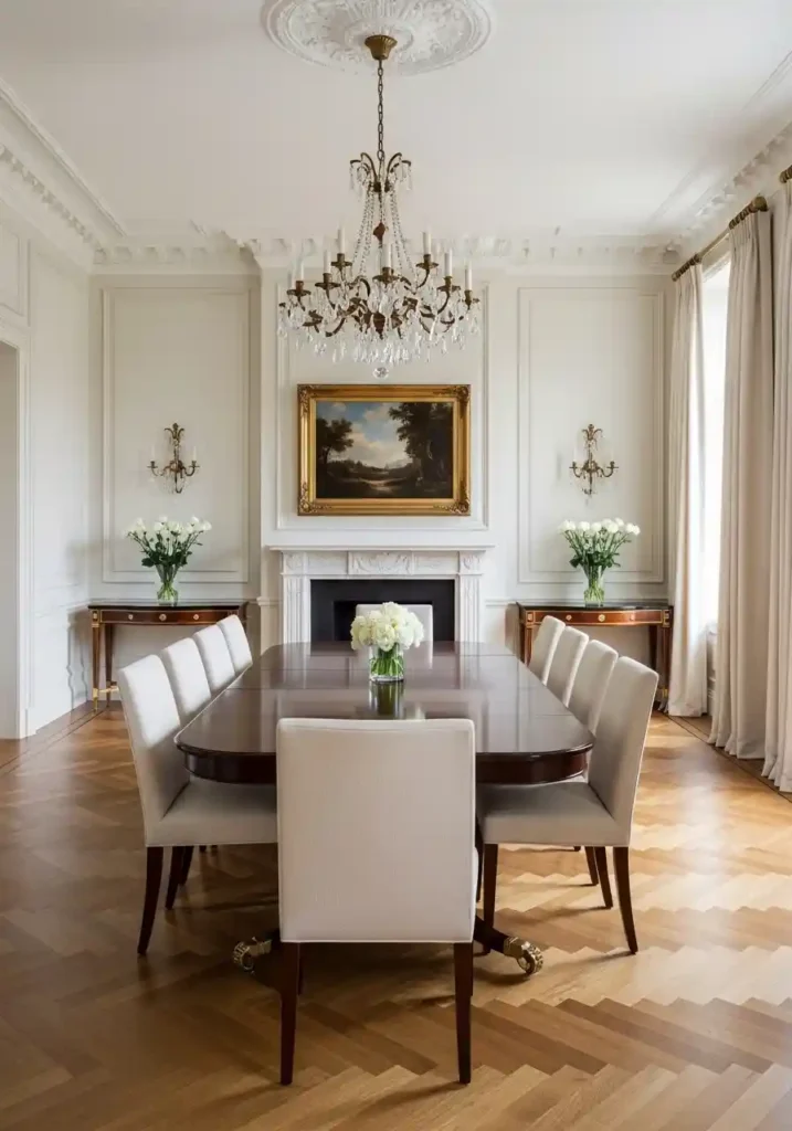The execution of genuine formal symmetry in a luxury dining room requires the most precise and most disciplined approach to furniture selection, placement, and accessory arrangement — every element must mirror its opposite with complete accuracy in both position and visual weight! A centered white marble fireplace on the main wall creates the perfect axis from which all other symmetrical relationships in the room are measured and maintained. Identical crystal sconces at precisely equal heights on either side of the fireplace. Matching console tables with identical flower arrangements flanking the fireplace precisely. Perfect symmetry communicated with complete authority.