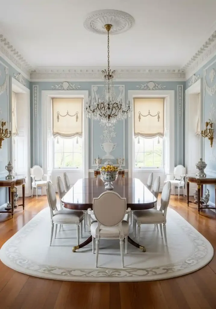 The Adamesque plaster decoration — the delicate shallow-relief ornamental plasterwork of classical motifs including urns, swags, paterae, honeysuckle, and Greek key patterns developed by Robert Adam into the most beautiful and most influential system of decorative interior architecture ever devised for British domestic interiors — is the single most important design element in the authentic Georgian luxury dining room, creating walls of extraordinary decorative richness achieved through the most refined and most restrained decorative means available! Pale blue or sage green within the plaster panels creates the most beautifully authentic Georgian color treatment.