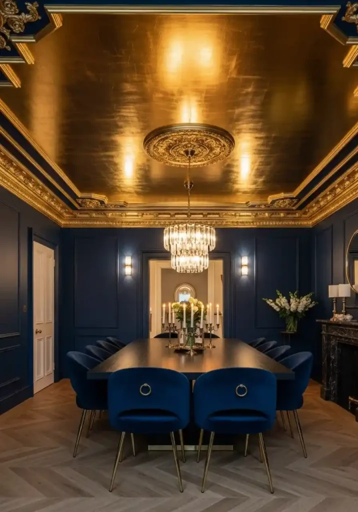 The combination of deep, rich wall color beneath a gold leaf ceiling creates the most dramatically beautiful material contrast available in luxury dining room design — the dark walls absorbing and concentrating the room’s light while the gold leaf ceiling above reflects and amplifies every warm light source in a relationship of extraordinary visual tension and mutual material enhancement of genuine opulence! Deep navy, rich forest green, and midnight charcoal all create magnificent contrasts with gold leaf ceilings. Apply gold leaf to the cornice molding at the ceiling-wall junction for the most beautifully resolved architectural transition between the dark walls and the golden ceiling above.