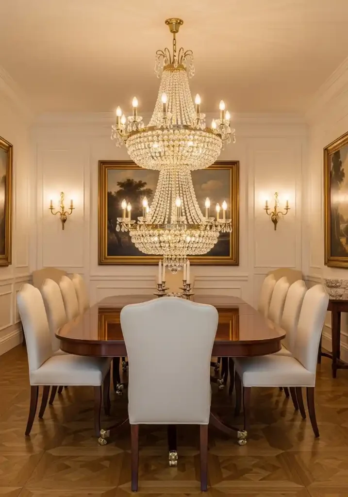A three-tier crystal chandelier of genuinely extraordinary scale above the luxury dining table is the single most impressive and most completely magnificent overhead installation available — the multiple tiers of crystal drops creating a cascading waterfall of prismatic light of such breathtaking visual complexity and such genuinely spectacular beauty that every other element in the dining room gracefully and naturally steps back into supporting roles, allowing the chandelier to perform as the undisputed, permanently magnificent, and completely dominant design star of the entire composition! Grand chandeliers transform dining rooms into genuinely regal spaces.