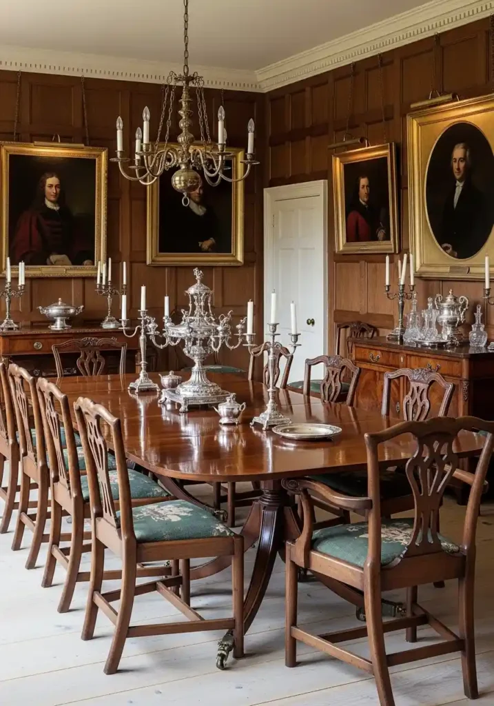 The most magnificent heirloom luxury dining rooms are those whose owners have inherited with genuine gratitude and displayed with complete respect the most extraordinary pieces their family history has produced — recognizing that a genuine eighteenth-century mahogany dining table with authentic provenance and beautiful original surface is more valuable, more beautiful, and more genuinely luxurious than any reproduction or contemporary equivalent at any price! Original Chippendale, Queen Anne, or Regency chairs around a period table. Family silver epergne as the centerpiece. Ancestor portraits in original frames. This is the luxury dining room whose beauty is completely and permanently beyond purchase — the most genuinely magnificent of all.