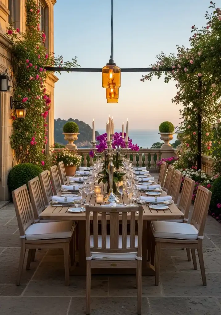 The most magnificent outdoor terrace luxury dining room installations are those where the quality of outdoor furnishings equals or approaches the quality of the finest indoor luxury dining rooms — weather-resistant teak furniture of exceptional craftsmanship, silver or crystal accessories of genuine formal quality, outdoor lighting of beautiful warm quality, and the most extraordinary plant and landscape setting available creating a terrace dining environment of complete, genuine, and magnificent luxury! The natural setting — whether a manicured formal garden, a wild coastal landscape, or an ancient walled garden — provides the most magnificent backdrop available and the most completely beautiful and most genuinely irreplaceable context for the finest possible al fresco luxury dining experience.