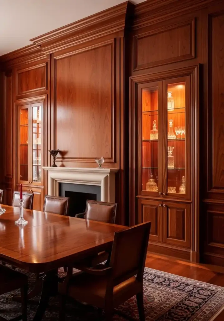 The architectural detail of the mahogany panel molding profiles is the element that most directly communicates the quality and ambition of the paneling installation — deep, well-proportioned raised panel moldings with correctly scaled stiles and rails create walls of genuine architectural richness and material dignity, while shallow, poorly proportioned panels create a result that fails to honor the magnificent material with the craftsmanship it deserves! Integrated glass-fronted display cabinets flanking a fireplace create the most classically beautiful and most functionally generous built-in furniture composition available in a formal mahogany dining room context.