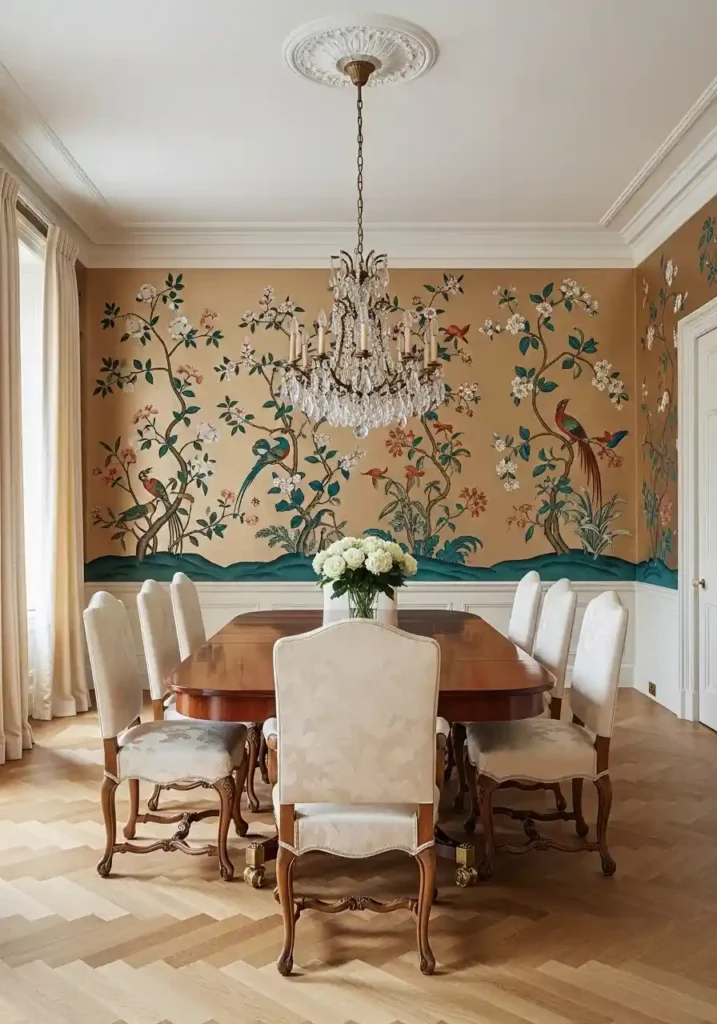 Hand-painted silk wallpaper in the chinoiserie tradition is the single most opulently beautiful and most completely artistic wall treatment available in luxury dining room design — each panel individually painted by master craftspeople using the finest pigments on genuine silk ground, creating walls of extraordinary botanical and decorative artistry that function simultaneously as the world’s most magnificent wallpaper and a continuous painted artwork of genuine museum quality! Silk wallpaper dining rooms represent the highest expression of decorative wall treatment available at any level of luxury investment.