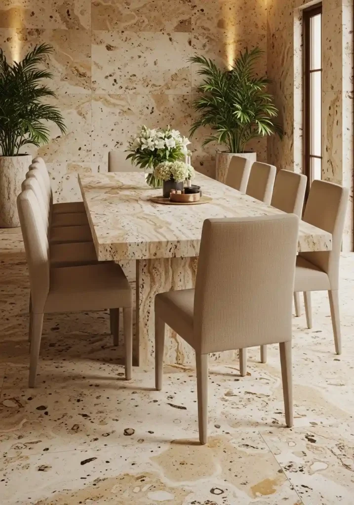 17. The Travertine and Linen Luxury Dining Room: Natural Stone Meets Organic Textile Perfection
