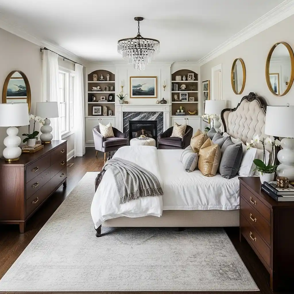 A symmetrical layout creates balance and visual harmony in a master bedroom. Matching nightstands, lamps, and decor frame the bed beautifully, giving the room a polished, hotel-inspired feel.