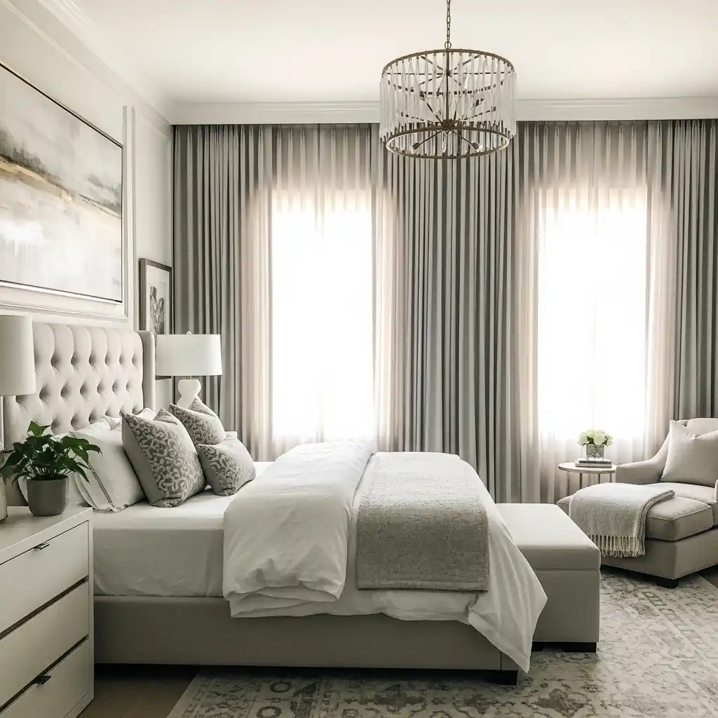 Neutral fabrics keep the bedroom calm and cohesive. Floor-length styles enhance height and sophistication. This approach creates a polished finish that aligns perfectly with cozy luxe bedroom aesthetics.
