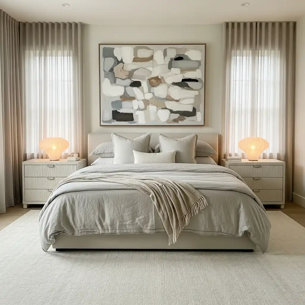 Neutral artwork adds personality without overwhelming a cozy luxe bedroom. Abstract prints, soft landscapes, or minimalist designs enhance the space while maintaining a calming atmosphere. Large-scale art above the bed creates a focal point that feels curated and intentional.