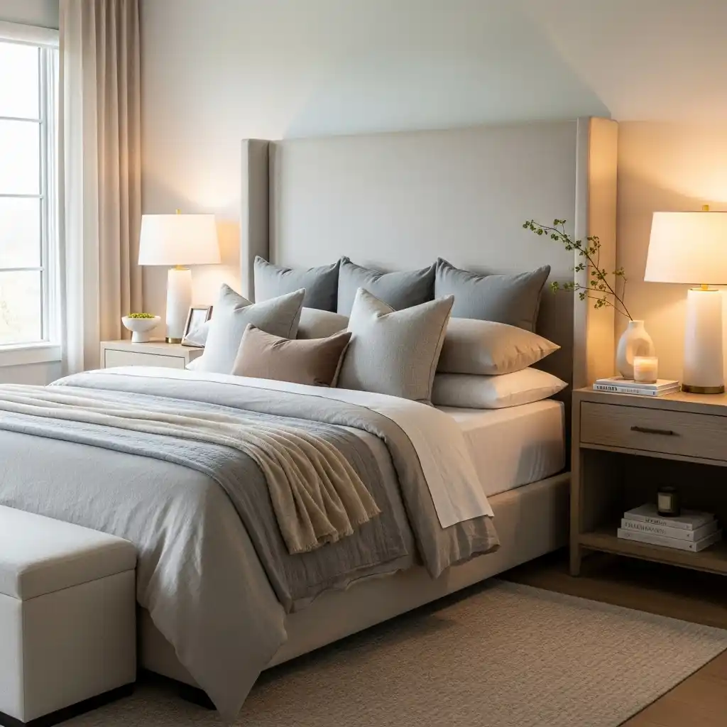 Decorative throw pillows add personality and texture to a luxe master bedroom. Mixing sizes, fabrics, and subtle patterns creates visual interest while maintaining a cohesive look. Neutral tones keep the space calming and elegant.