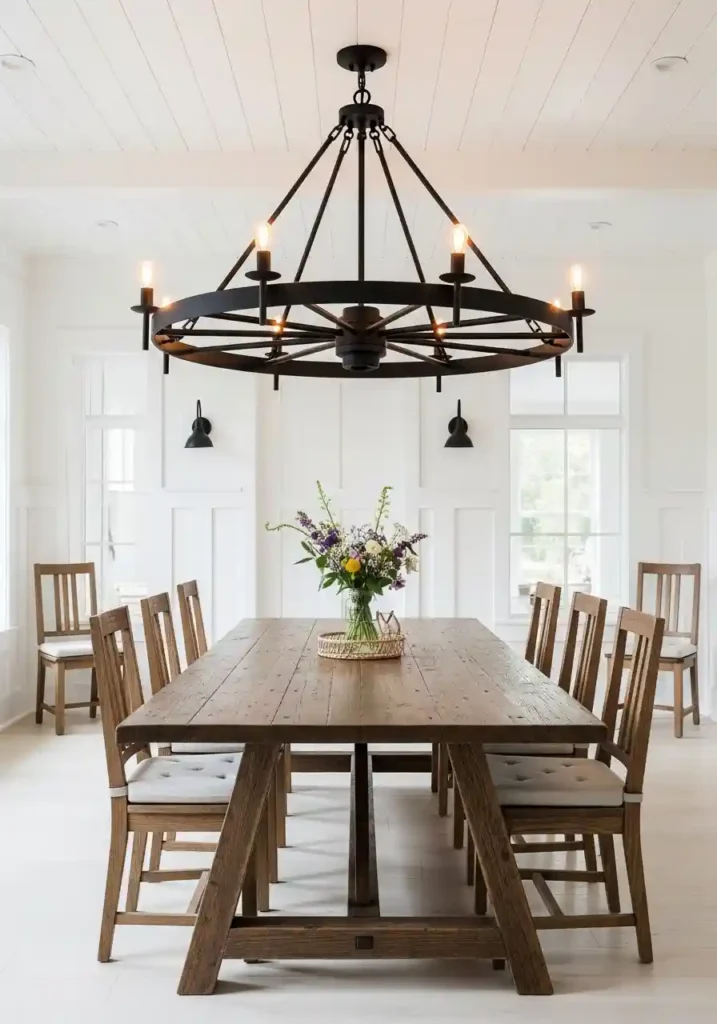 A black iron chandelier above the farmhouse dining table is the most instantly recognizable and most powerfully atmospheric lighting fixture available in the modern farmhouse aesthetic — the substantial black metal construction creating an industrial drama overhead that anchors the entire dining room’s design with genuine visual authority, while the warm glow of Edison bulbs through the fixture’s arms creates the most beautiful, most warmly inviting amber light quality imaginable for shared meals of any occasion from weekday family dinners to holiday celebrations!