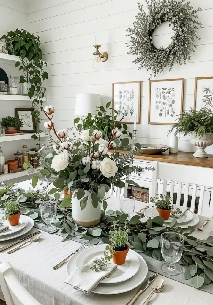 The most beautiful botanical farmhouse dining room styling combines fresh, dried, and living plant elements at every scale throughout the space — a generous fresh floral centerpiece creating the primary visual statement at the table’s center. Dried eucalyptus and cotton stem arrangements on the shelving and sideboard creating year-round botanical warmth. Small fresh herb pots at individual place settings creating intimate botanical gifts for each diner. A dried wreath on the wall creating architectural botanical beauty above eye level. Trailing plants on shelving adding living, breathing organic movement to the static botanical displays.