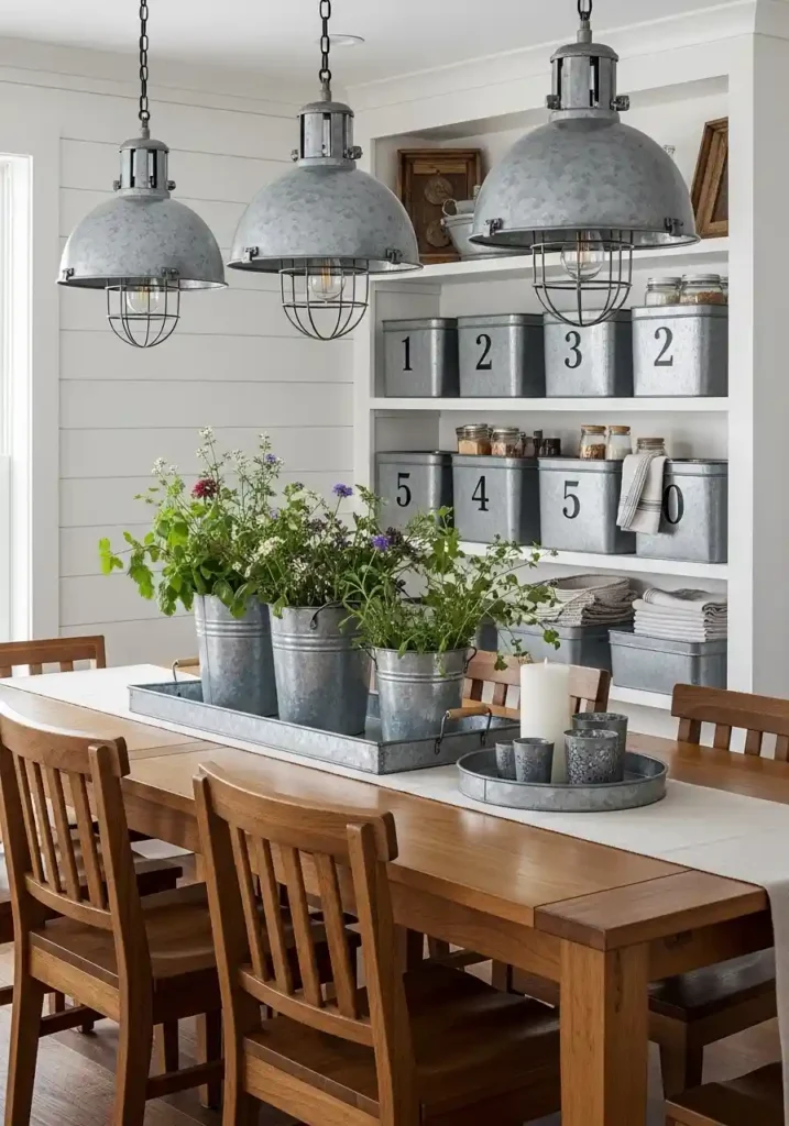 Galvanized metal accents in a modern farmhouse dining room create the most authentically industrial-agricultural and most genuinely material-honest farmhouse aesthetic available — referencing the actual history of farm buildings, farm equipment, and farm storage in a material language of complete authenticity that creates the most convincing and most deeply satisfying connection between the domestic farmhouse interior and the genuine agricultural heritage it celebrates! Galvanized metal in the dining room is farmhouse design telling the most completely honest version of its own beautiful story.