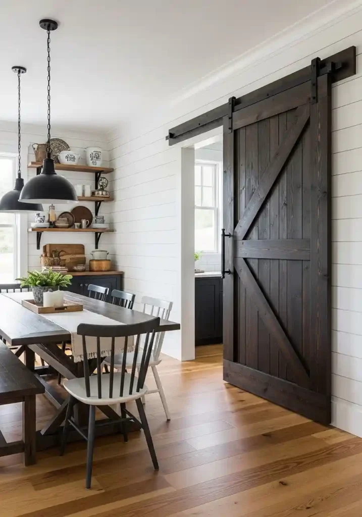 17. The Farmhouse Dining Room With Sliding Barn Door: Dramatic Hardware and Rustic Soul