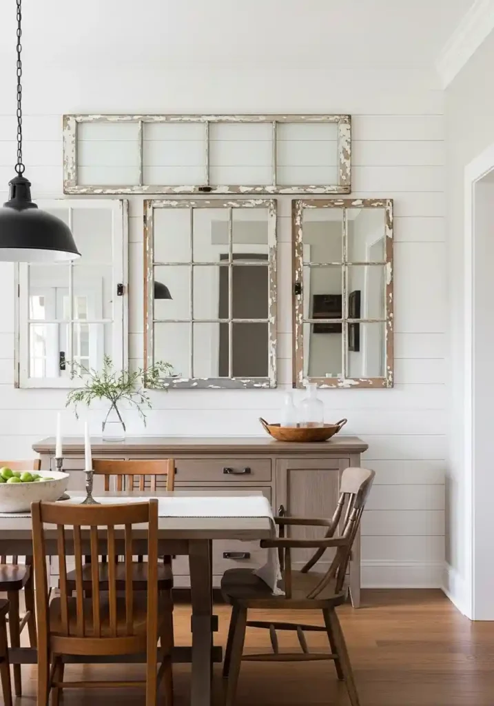 Vintage salvaged window frames used as decorative wall art in the modern farmhouse dining room create the most architecturally authentic and most genuinely historically resonant salvage art available — old multi-pane windows with their original glass, their beautiful aged paint in various stages of peeling, and the genuine weathering of decades or centuries of outdoor exposure creating wall pieces of extraordinary individual character and irreplaceable historical depth that manufactured farmhouse art prints, however beautifully designed, can never replicate!