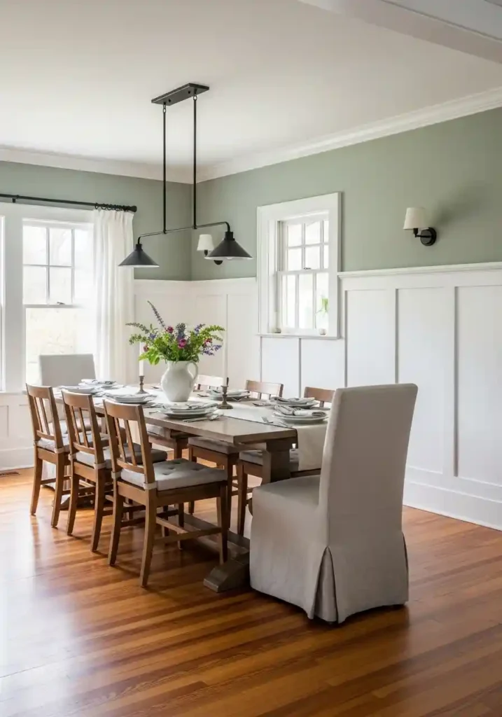 The most beautiful wainscoting-and-paint farmhouse dining room combinations are those that use the dado rail line as a deliberate color and material transition — crisp white beadboard below creating brightness and craft detail, with a warmer, more botanical color above creating depth and personality that pure white walls alone cannot achieve! Sage green above white beadboard creates the most beautifully botanical and most warmly organic modern farmhouse dining room. Soft blue above white beadboard creates fresh, airy, coastal-farmhouse character. Warm cream above white beadboard creates a tonal, elegantly quiet farmhouse atmosphere of genuine restraint.