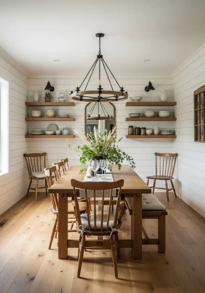 Open wooden shelving in a modern farmhouse dining room creates the most warmly abundant, most genuinely characterful, and most authentically personal dining backdrop available — displaying the beautiful ceramic tableware, honest mason jar glassware, well-used serving pieces, and meaningful objects of daily farm life in a way that communicates genuine domestic richness and the most complete expression of farmhouse aesthetic values: function is beautiful, abundance is generous, and everyday objects displayed with care are the most authentic and most deeply satisfying form of home decoration!