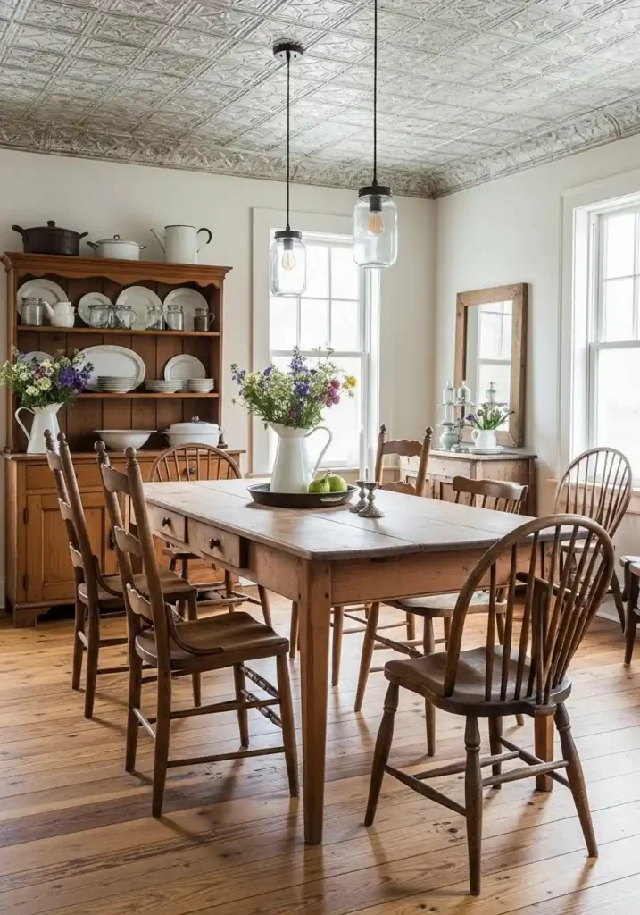 The most authentic vintage farmhouse dining rooms are those whose owners approach the design process as genuine antique hunters and passionate vintage collectors rather than simply shoppers — spending time in estate sales, antique markets, farm auctions, and architectural salvage yards searching for pieces with genuine history and authentic patina that mass-market vintage-inspired reproductions can never replicate regardless of their visual similarity to the real aged materials they imitate! An original nineteenth-century farm table. A genuine collection of pressed-back country chairs. A real antique pie safe repurposed as a sideboard. Each authentic piece adds irreplaceable historical depth and genuine farmhouse soul.