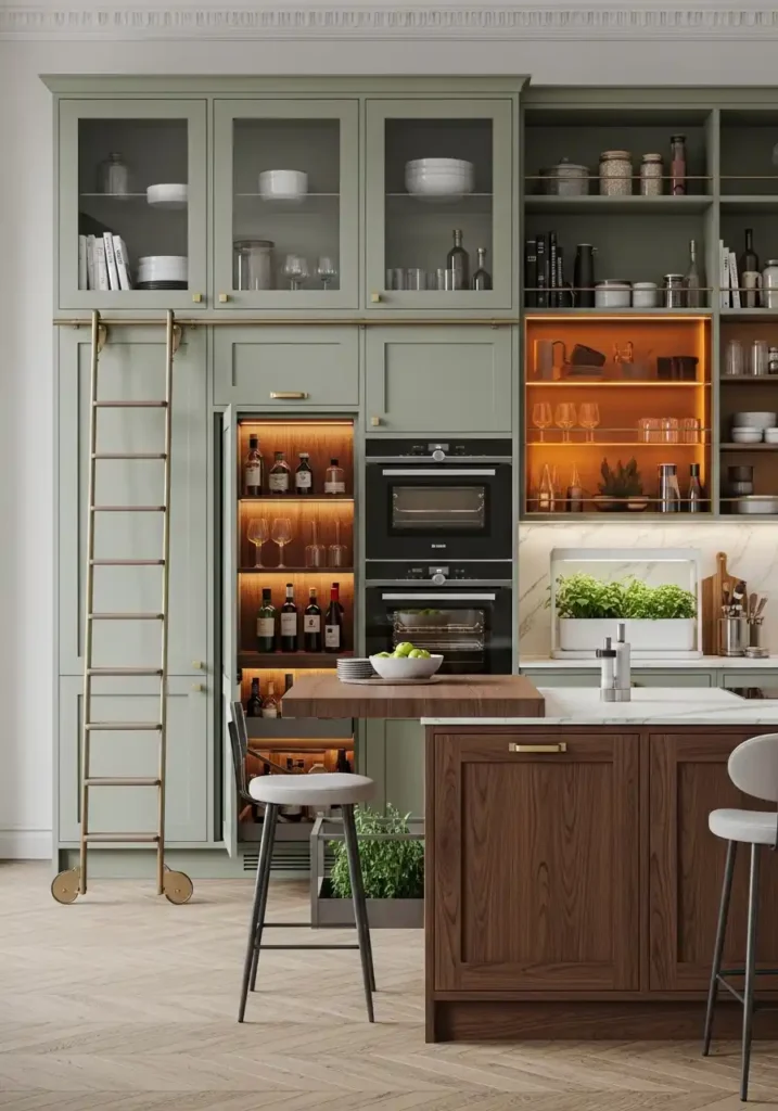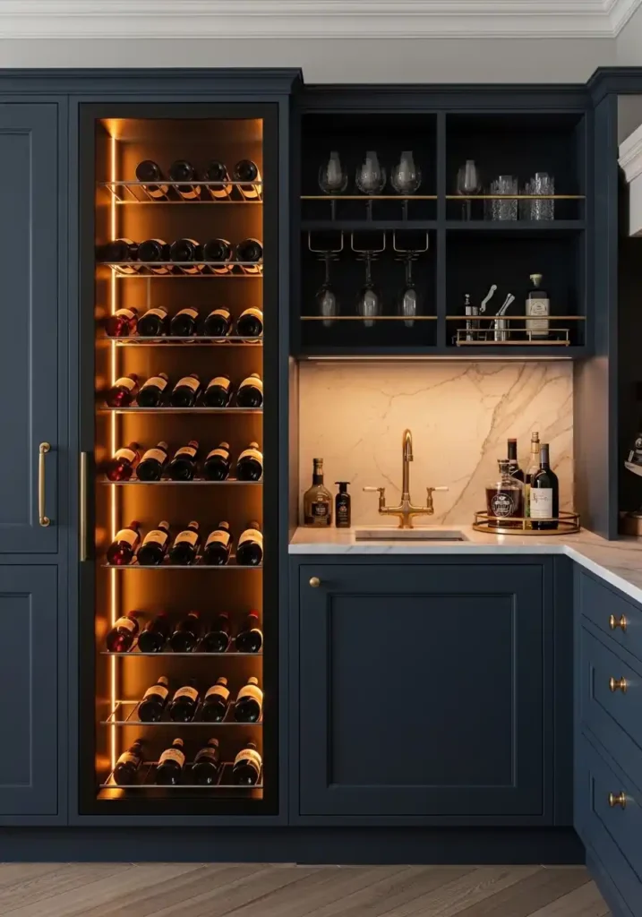 The warm amber backlighting within the wine display module is the specific lighting detail that transforms the functional wine storage component into a genuinely spectacular visual feature of the entire kitchen — because warm LEDs installed behind the wine display shelving create a pool of rich, amber, bottle-interrupted light that makes the wine module appear to glow from within with its own warm internal fire rather than simply to be illuminated from an external source. The glowing wine module becomes one of the kitchen’s most visually magnificent evening features, adding a layer of warm, concentrated amber light that makes every gathering in the kitchen feel like the most beautifully hosted event.