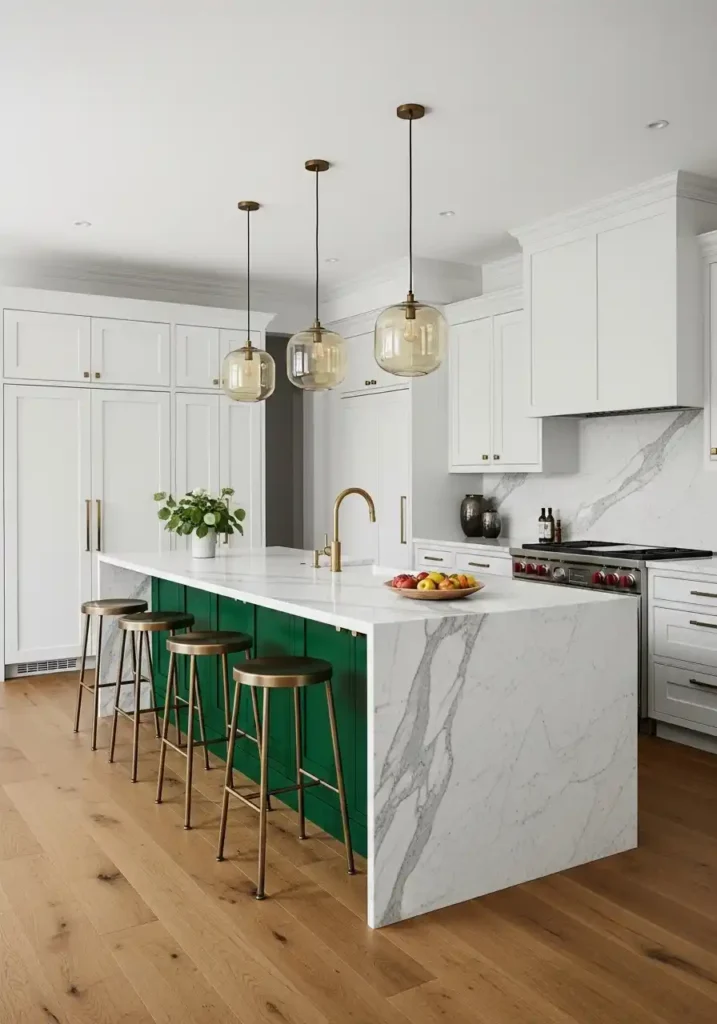 Deep forest green is the contrasting island color that creates the most organically beautiful and the most completely resolved visual relationship with white perimeter modules — because forest green’s specific combination of depth, botanical warmth, and natural richness creates a color of such genuine material character that it appears to be drawn from the natural world rather than selected from a paint chart. Against white modular perimeter units, the forest green island appears more vivid, more saturated, and more magnificently beautiful than it would in any other context — the white amplifying the green’s natural intensity while the green makes the surrounding white appear cleaner and more luminously pure by its magnificent contrasting presence.