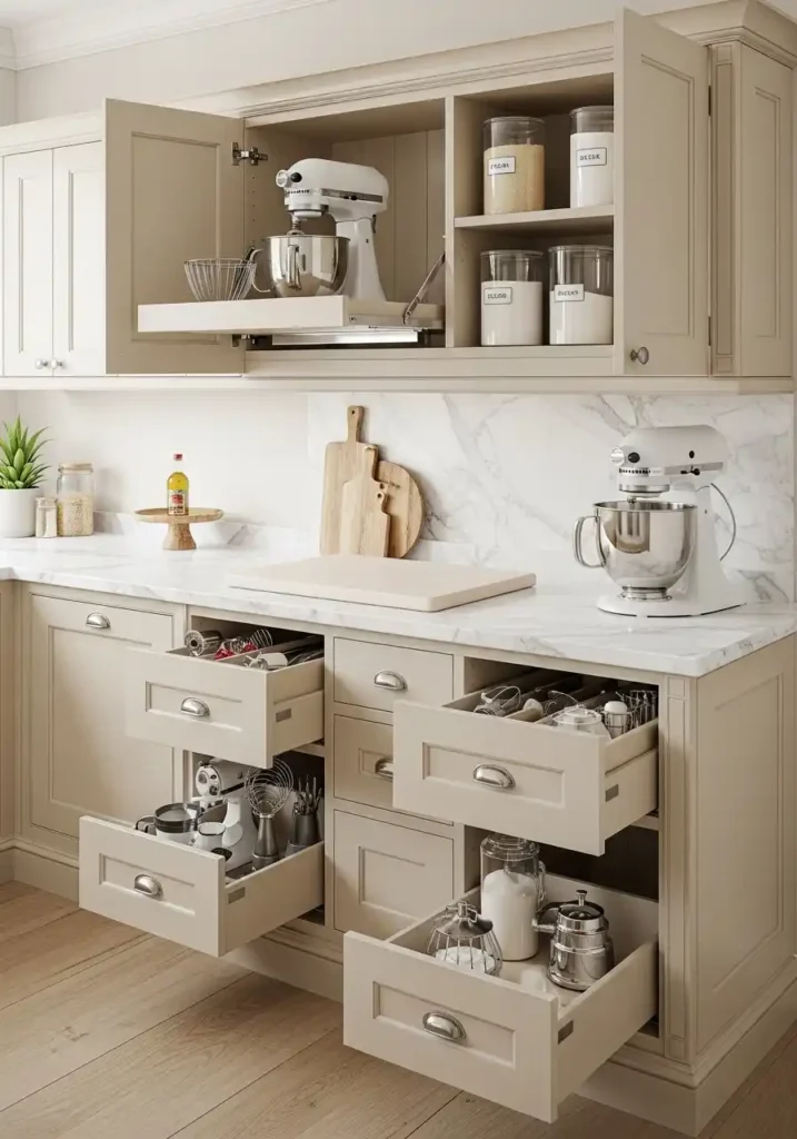 The pull-down mixer shelf mechanism within the baking module overhead cabinet is the engineering detail that most powerfully and most practically improves the daily baking experience — because a stand mixer stored at counter height occupies permanent, precious counter space, while a stand mixer stored in an upper cabinet requires awkward, heavy lifting to retrieve and return, creating a genuine daily deterrent to using it. The pull-down shelf lowers the mixer to the perfect working height at the touch of a hand, provides a stable working platform at counter level, and returns the mixer to its overhead storage position with equal ease — making the stand mixer as accessible and as convenient as any other kitchen tool.