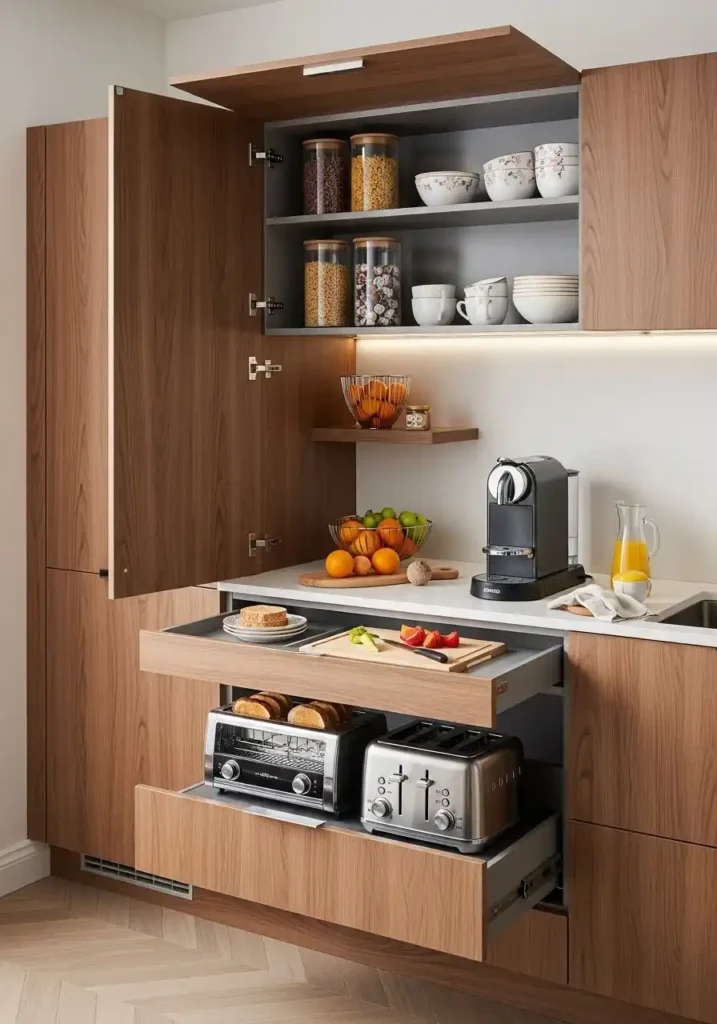 The built-in toaster in a pull-out drawer module is the breakfast component detail that most brilliantly solves one of the kitchen counter’s most persistent space-consumption problems — because a toaster that lives in a pull-out drawer at counter height, accessible during use by simply opening the drawer and operating it in situ, and completely concealed when not in use by closing the drawer flush with the surrounding modular cabinet fronts, delivers the full functionality of a counter-top toaster with zero permanent counter-top footprint. The drawer toaster makes the breakfast module’s promise of a clutter-free morning counter completely, elegantly, and permanently real.