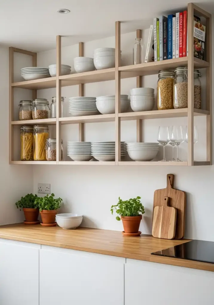 A modular floating shelf system replacing all upper cabinets in a kitchen is the component decision that delivers the most immediate and the most completely convincing improvement in the kitchen’s perceived spaciousness — because a modular shelf system with consistent module dimensions creates a wall of open, organized, beautifully curated display that the eye reads as open space rather than visual barrier, making the kitchen feel significantly wider, significantly lighter, and significantly more generous than the same kitchen with closed upper cabinet modules of equivalent storage capacity. The floating shelf module system is the modular kitchen’s most powerful spatial expansion tool.