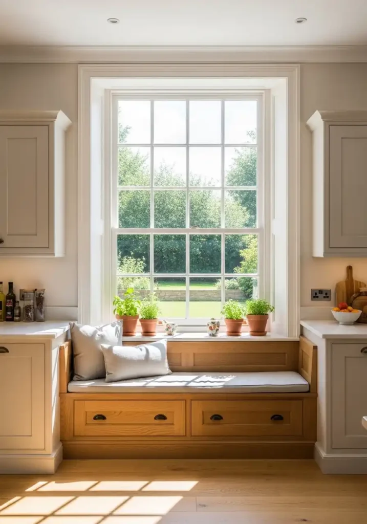 The window seat module at the base of the floor-to-ceiling window is the component that most completely and most beautifully utilizes the deep, sun-warmed space immediately in front of the full-height window — because a modular window seat with a proper cushion, proper storage beneath, and a position bathed in the best natural light available in the entire kitchen creates the most sought-after and the most genuinely beloved spot in the kitchen: a place to sit in the morning sun with a cup of coffee, a place to read a recipe with perfect natural light, or a place for a child to sit and talk to the cook during meal preparation. The window seat module makes the kitchen genuinely, daily irresistible.