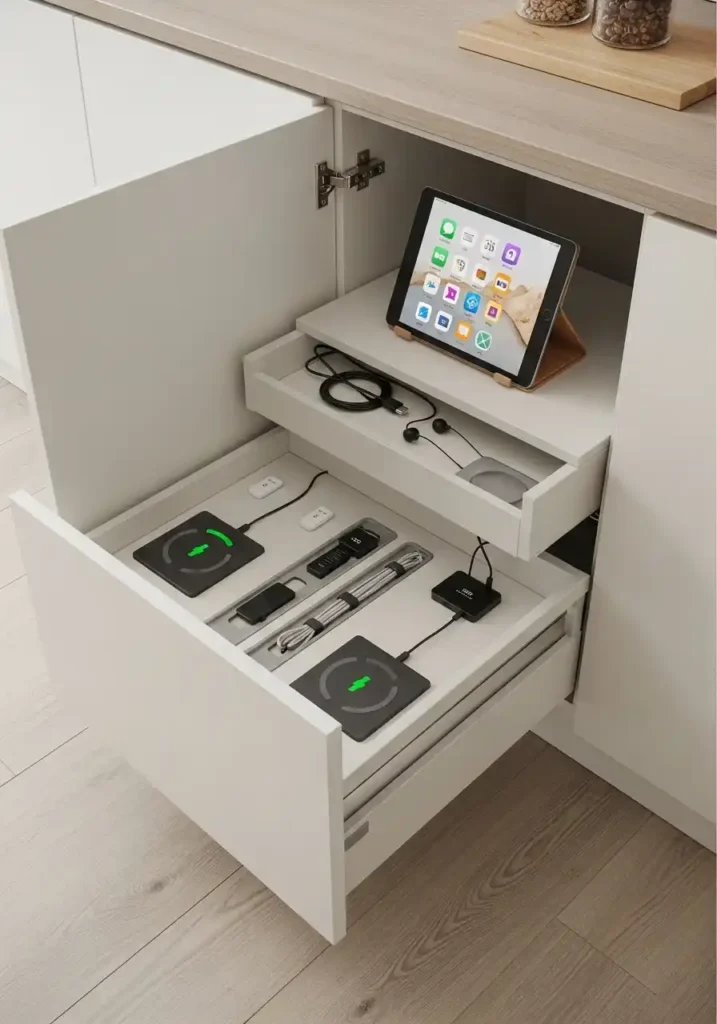 The wireless charging pad recessed into the base of the tech drawer module is the specific component detail that most elegantly solves the kitchen counter’s most chronic cable problem — because a wireless charging pad installed flush with the drawer floor allows phones and wireless earphones to be placed in the drawer and charged without any cables needing to enter or exit the module, creating a completely cable-free charging solution of such complete, effortless elegance that the daily act of charging kitchen devices becomes as simple and as beautiful as placing them in their drawer. No cables on the counter. No tangled charging equipment. Just a beautiful, organized kitchen.
