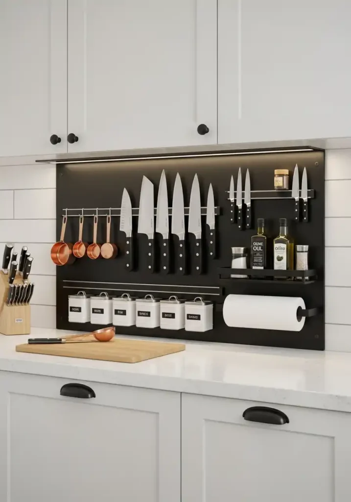 A magnetic tool wall module integrated into the modular kitchen’s backsplash zone is the organization component that most completely and most beautifully converts the kitchen’s most functional and most frequently accessed tools from hidden, drawer-stored items requiring individual searching and retrieval into a permanently visible, permanently accessible, beautifully organized wall display of everything needed for efficient, joyful daily cooking. The magnetic module places the knife collection, the measuring tools, the spice tins, and the frequently used accessories in the single most convenient position available in the kitchen — the backsplash zone directly above and behind the primary preparation surface.