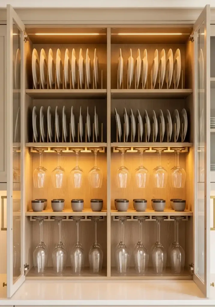 A dedicated plate and glass storage module with custom vertical plate rack inserts and inverted glass holders is the modular kitchen’s most beautifully organized and most practically excellent tableware storage solution — because vertical plate storage where each plate stands independently in its own slot is simultaneously the most space-efficient plate storage format and the most accessible one, allowing any specific plate to be retrieved without disturbing any other plate in the module. Inverted glass storage suspended by the stems in fixed holders below the plate section provides the same individual accessibility for glassware in a configuration that is simultaneously beautiful and permanently organized.