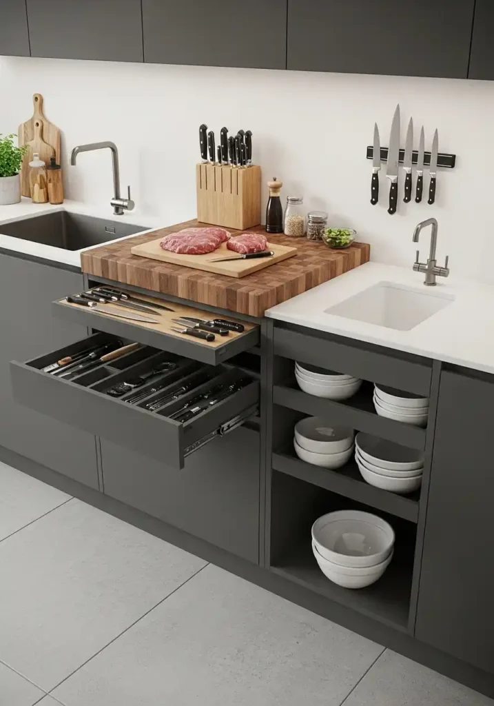 The thick end-grain butcher block insert within the preparation module countertop is the specific preparation surface that creates the most complete, the most practical, and the most culinarily appropriate preparation environment for serious knife work — because end-grain butcher block is simultaneously the most knife-friendly preparation surface, the most hygienic, and the most self-healing preparation material available, with its cross-cut grain structure absorbing knife marks naturally and closing back over them as the wood dries, maintaining a permanently smooth, permanently hygienic, permanently beautiful preparation surface through years of intensive daily use that a stone or composite surface of equivalent quality cannot approach for the specific pleasures of serious knife work.