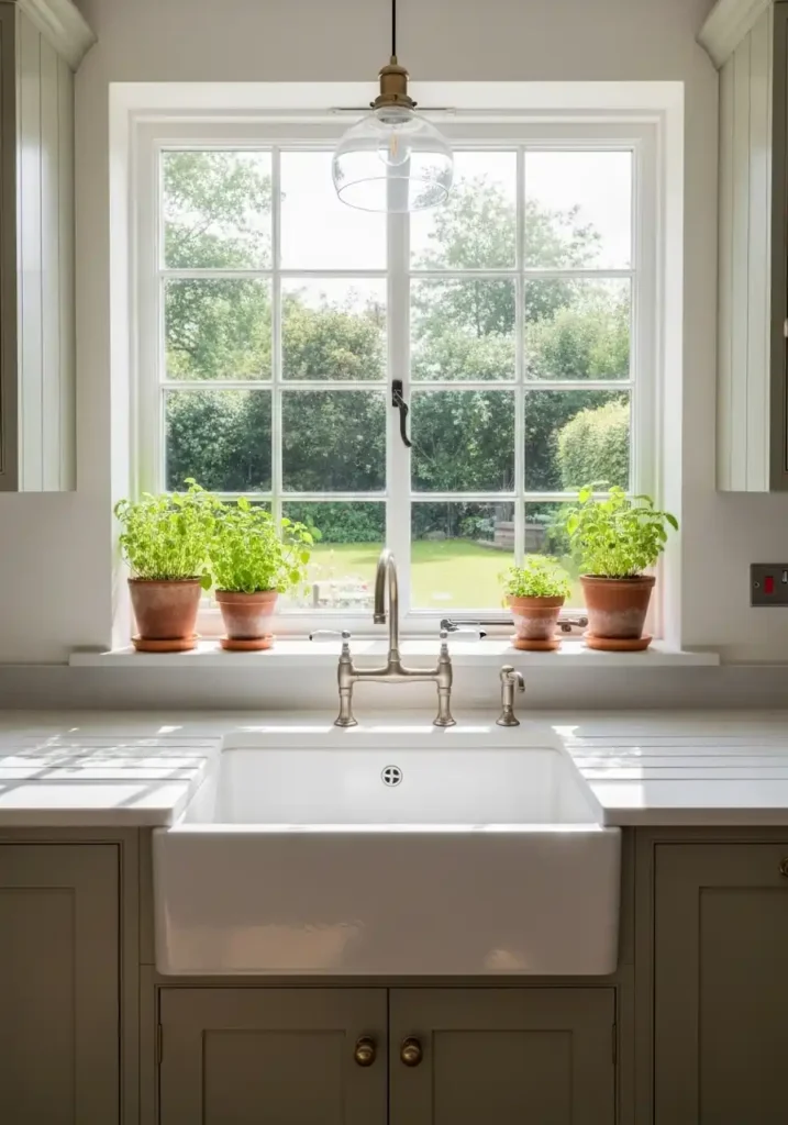 The herb garden established on the window sill directly above the centered sink module is the practical and sensory bonus that completes the window sink module’s contribution to the daily kitchen experience — because herbs positioned on the window sill above the sink are at the most naturally lit, the most conveniently watered, and the most immediately accessible position in the entire kitchen for the cook who reaches for fresh herbs during every meal preparation. The proximity of the herbs to the sink makes washing fresh-cut herbs completely effortless, and the fragrance of the herb garden filling the sink area with fresh rosemary, basil, and mint makes the kitchen’s most functional position its most sensory-rich one.
