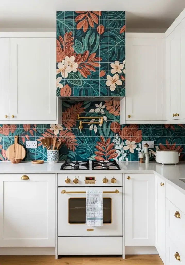 The hand-painted ceramic tile backsplash module is the artistic kitchen component of the greatest individuality and the greatest permanent beauty — because ceramic tiles hand-painted by a skilled artist to a specific brief create a kitchen wall of such completely individual, completely unrepeatable botanical beauty that no manufacturing process and no budget can duplicate it anywhere else in the world. The modular framework that surrounds the hand-painted backsplash module — the crisp white cabinets flanking it on both sides — creates the perfect neutral architectural setting for the painted tile artwork, allowing the colors, the brushwork, and the botanical compositions of the ceramic art to be seen with complete, uninterrupted visual clarity and complete, genuine appreciation