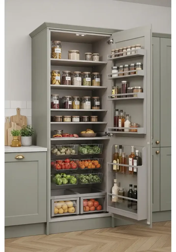 The pull-out shelf inserts within the tall larder module are the internal components of greatest practical consequence — because shelves that extend fully beyond the larder’s cabinet opening when pulled out make every item stored in the larder’s full depth simultaneously visible and simultaneously accessible without any reaching, rummaging, or removal of front items to access rear ones. This quality of complete, immediate, effortless accessibility to every stored item in a fully stocked larder creates a daily cooking experience of such genuine organizational pleasure and genuine culinary inspiration that a kitchen without a tall larder module always feels comparatively inadequate by contrast.