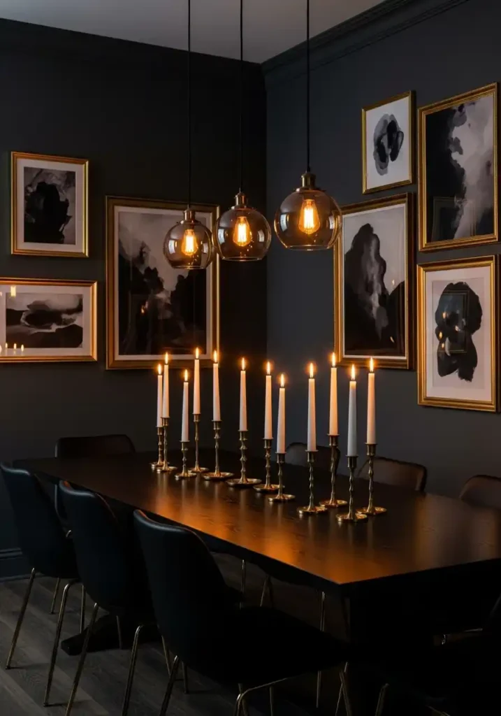 The relationship between deep charcoal and warm gold is one of interior design’s most reliably extraordinary color pairings — and in a moody dining room context, it reaches its full, glorious potential. The coolness of the charcoal creates the perfect backdrop against which every warm gold element — candlestick holders, picture frames, chair legs, pendant light fixtures — glows with an intensity and warmth it would never achieve against a lighter wall color. Add tall white taper candles burning on the table and the room transforms completely, the flickering light catching every gold surface in the room and sending warm, dancing reflections across the charcoal walls in a display of effortless, atmospheric beauty that no fixed lighting system could ever fully replicate.