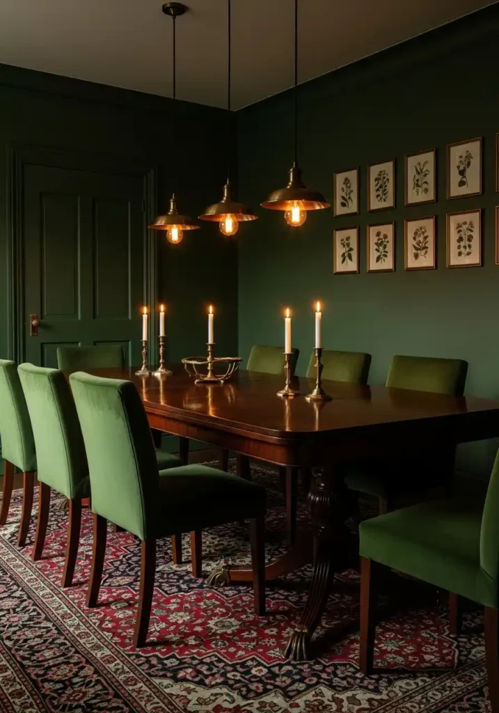 The combination of forest green walls with dark mahogany or walnut furniture and warm brass fixtures is a trinity of materials and colors that has a near-mystical ability to create an atmosphere of rich, warm, enveloping luxury that makes every person who sits at the table feel like they have been invited somewhere genuinely special. The brass picks up the warmth in the wood tones and amplifies it against the cool depth of the green walls in a way that feels perfectly calibrated, as though the three elements were designed for exactly each other. A vintage Persian rug in jewel tones of ruby, sapphire, and emerald anchors everything on the floor with the kind of layered, storied beauty that only genuinely old textiles possess.