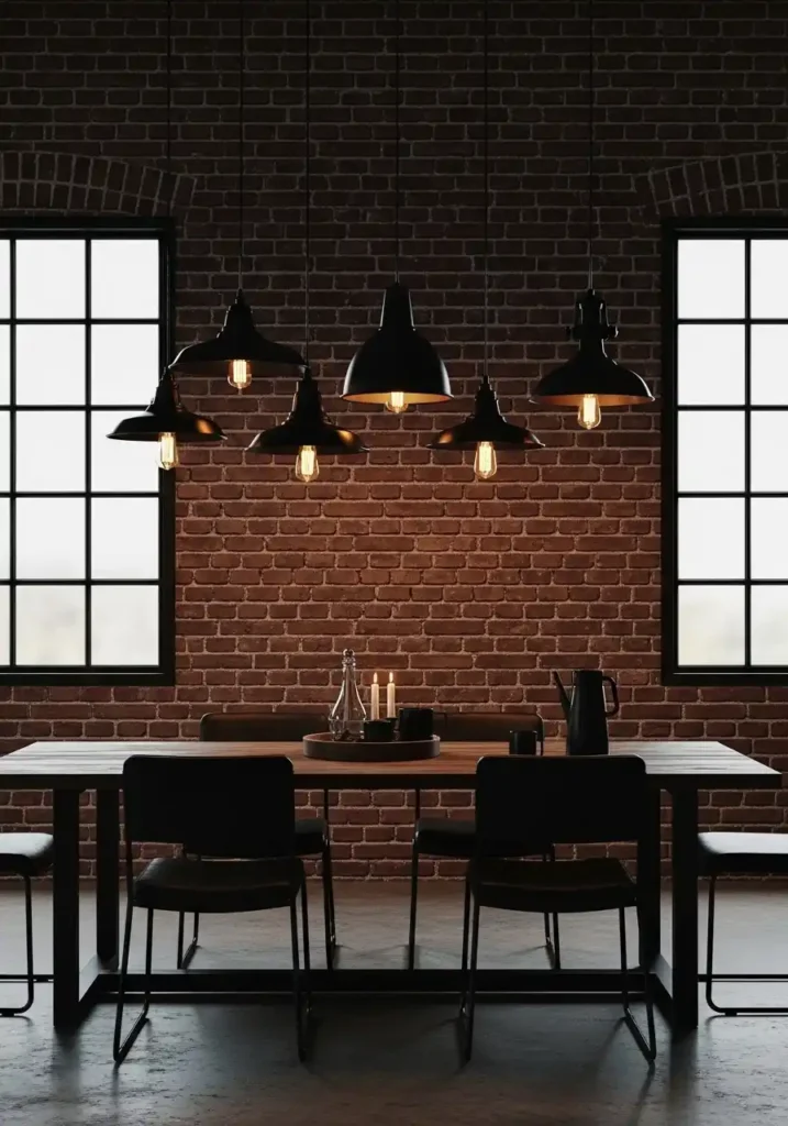 Building a moody industrial dining room around an exposed brick wall requires careful attention to the balance between the room’s dark, edgy aesthetic and the warmth that makes it genuinely inviting for extended meals and evening gatherings. A long reclaimed wood dining table with black iron legs bridges the industrial and the organic beautifully, its warm wood tones softening the hard edge of the metal without undermining the room’s industrial character. Mismatched vintage industrial pendant lights hanging at varying heights above the table create an overhead composition that feels collected and authentic rather than designed, which is exactly the quality that makes industrial interiors so compelling and so genuinely beautiful at their best.