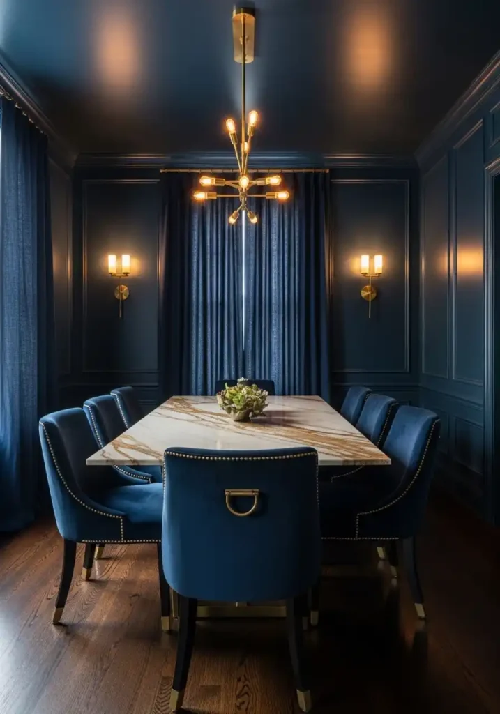Pairing midnight navy walls with plush velvet dining chairs in the same deep tone creates a tonal monochromatic effect of extraordinary sophistication — the chairs blend into the walls at a distance in a way that makes the white marble dining table appear to float in a sea of deep blue, illuminated from above by the warm amber glow of a brass chandelier. The marble veining picks up the warm gold tones of the brass fixtures and amplifies them across its surface, creating a visual conversation between the cold geological beauty of the stone and the warm, crafted beauty of the metalwork above it. This is a dining room that makes every dinner party feel like an event of genuine consequence and beautiful memory.