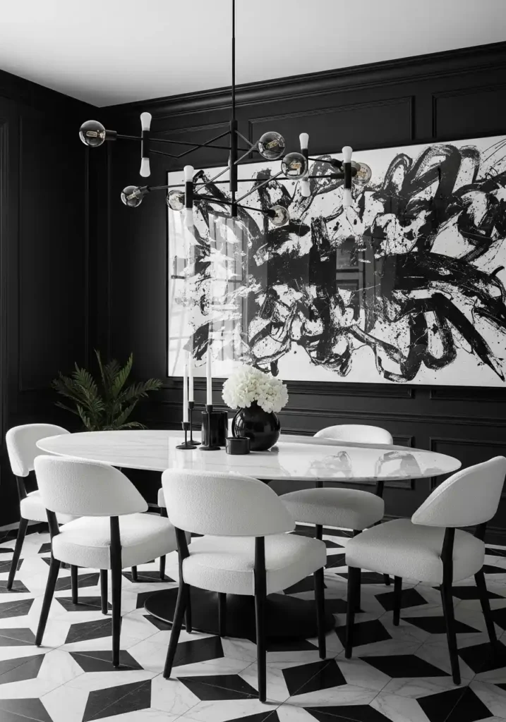 The key to a black and white moody dining room that feels artistic rather than merely high-contrast is the quality and thoughtfulness of every element within the strict palette. A white marble dining table — with its natural gray veining and its cool, luminous surface — brings the most beautiful version of white to the room’s central piece. A sculptural black chandelier with organic or geometric form occupies the space above the table with design confidence. One oversized, masterfully composed black and white abstract artwork spanning a full wall transforms that surface into a gallery piece of genuine power. Black and white geometric floor tiles add a pattern at the base level that reinforces the room’s graphic vocabulary from floor to ceiling.